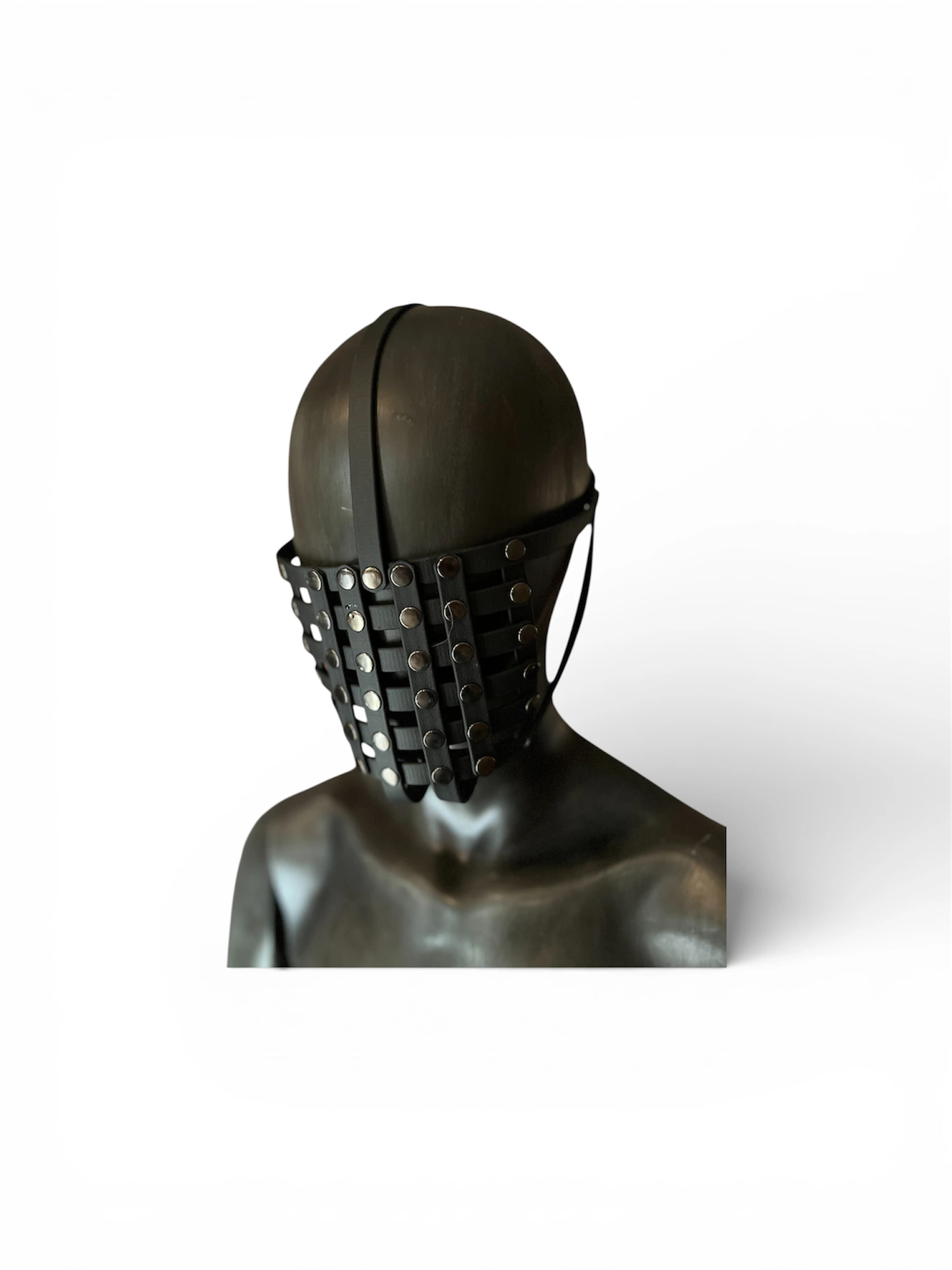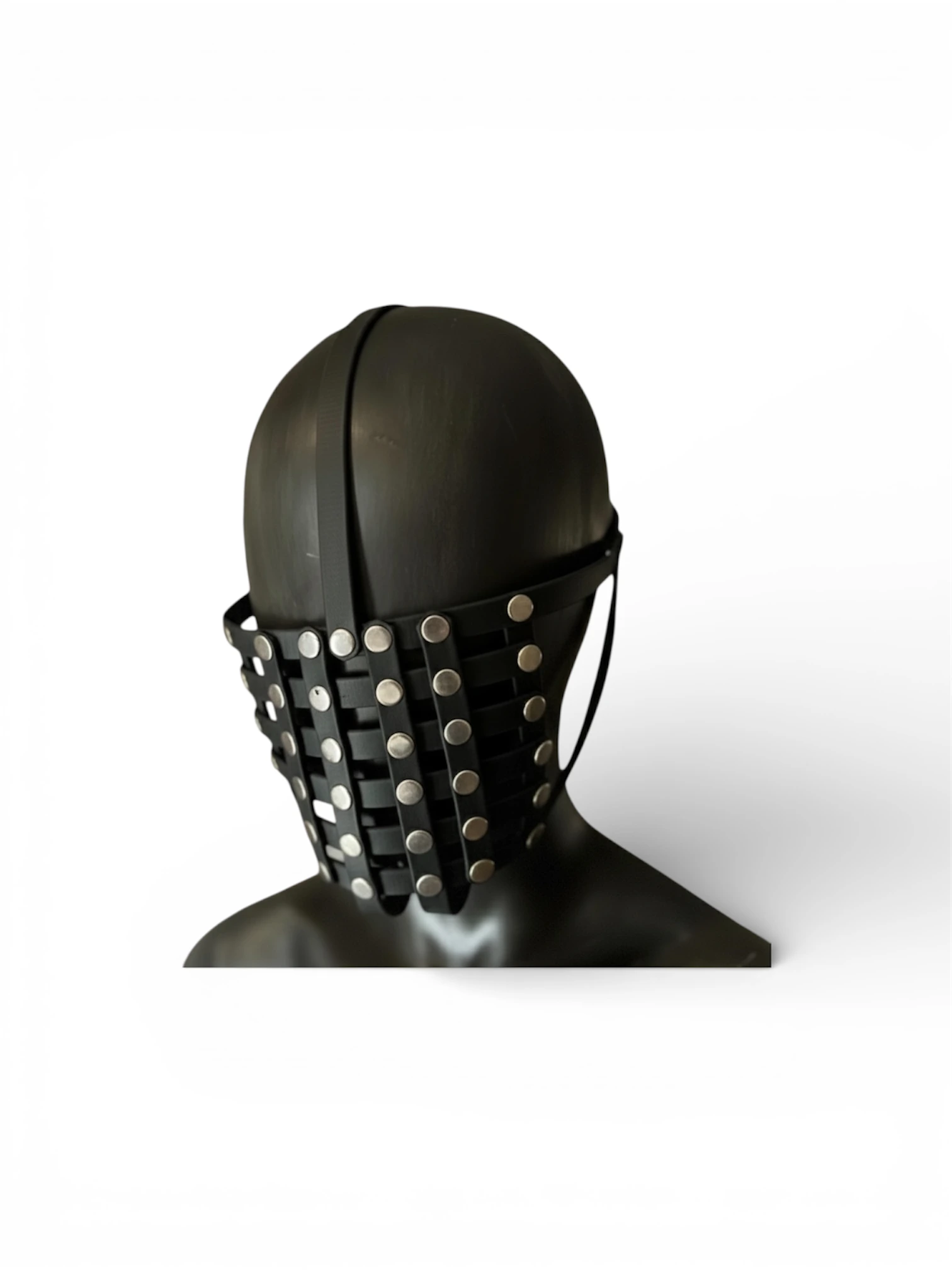 Ein unverkennbares Accessoire für wahre Kenner. Diese Maske, aus hochwertiger, schwarzer BioThane - die Leder ähnelt - und mit robusten Metallnieten versehen, umhüllt das Gesicht in einer einzigartigen, geheimnisvollen Weise. Jeder Blick, jedes Detail spricht von Macht und Kontrolle. Die Linien sind scharf, die Ästhetik unmissverständlich – ein Statement, das sowohl im Schatten als auch im Licht seine Wirkung entfaltet.