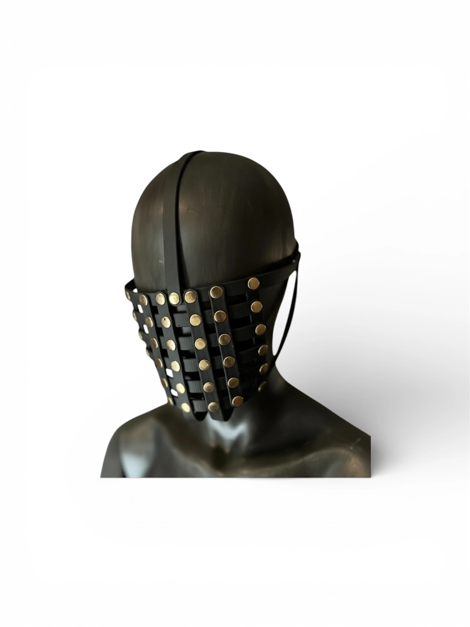 Ein unverkennbares Accessoire für wahre Kenner. Diese Maske, aus hochwertiger, schwarzer BioThane - die Leder ähnelt - und mit robusten Metallnieten versehen, umhüllt das Gesicht in einer einzigartigen, geheimnisvollen Weise. Jeder Blick, jedes Detail spricht von Macht und Kontrolle. Die Linien sind scharf, die Ästhetik unmissverständlich – ein Statement, das sowohl im Schatten als auch im Licht seine Wirkung entfaltet.